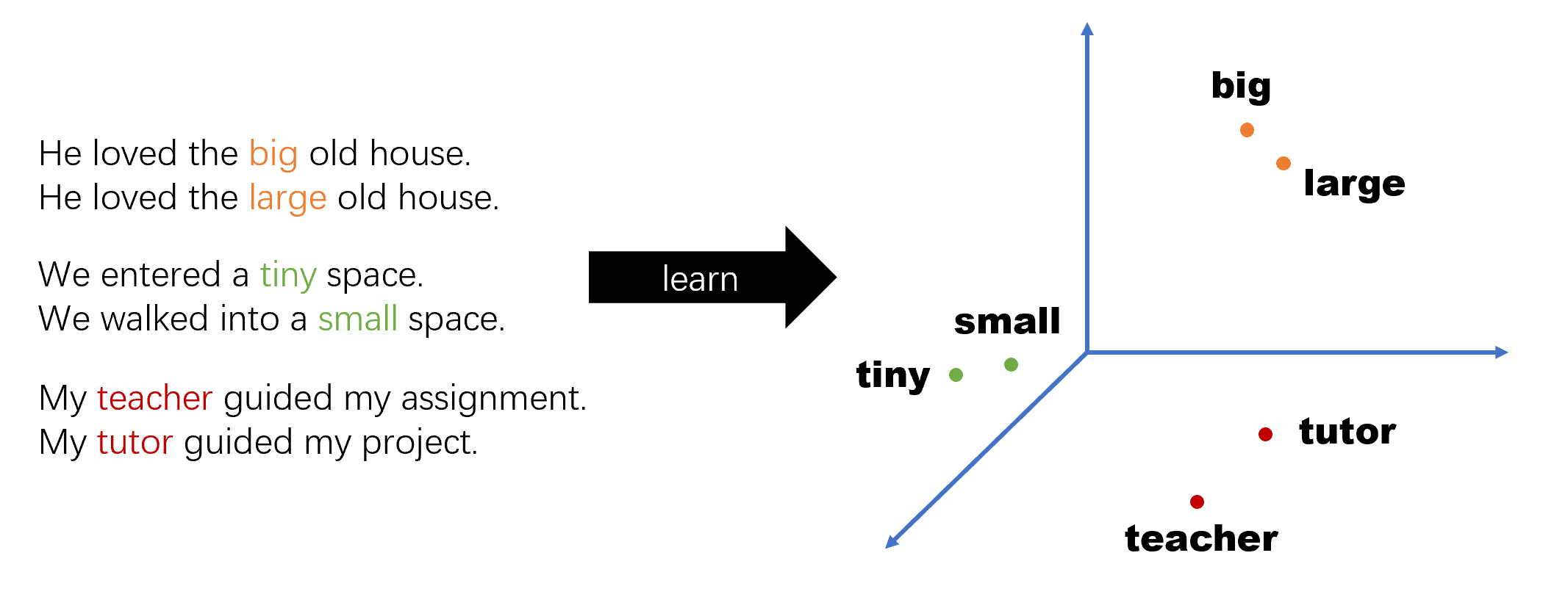 word2vec的基本思想是根据单词的上下文来学习单词的语义,这就意味着那些经常出现在相同上下文中的单词,映射到向量空间后其欧几里得距离会比较相近。比如给神经网络输入两个句子:He loved the big old house. He loved the large old house. 由于big和large出现在了相似的上下文中,因此神经网络会认为它们具有相近的语义,然后将它们映射到同一片向量空间中,当上下文相似的句子出现得越多,两个单词在向量空间中就会越接近。