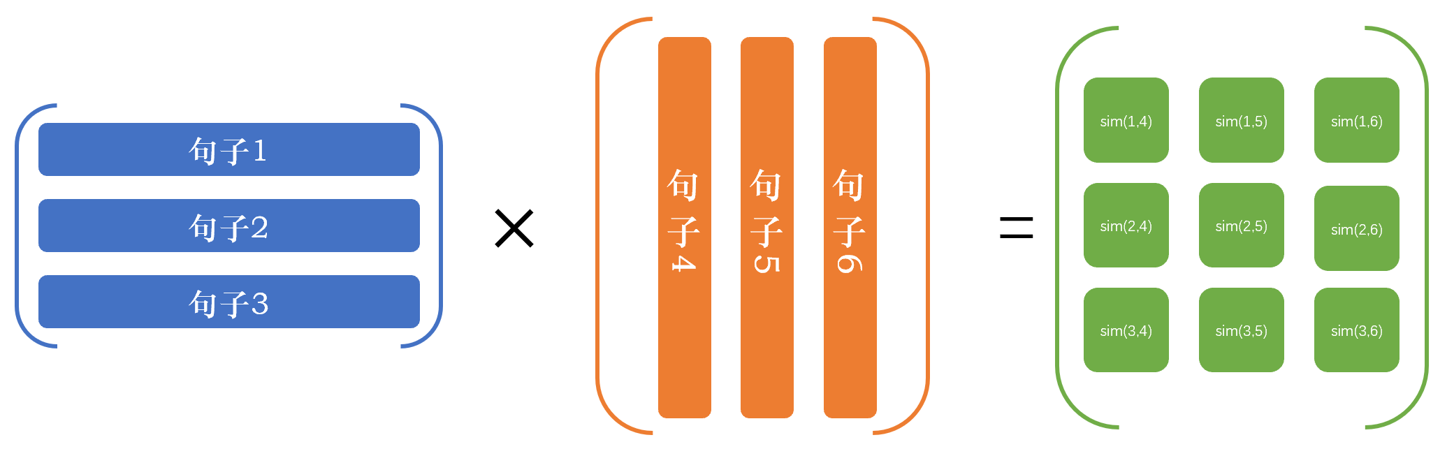 将一篇文章分句后,再获得每个句子的向量,将这些向量组合成一个矩阵,这个矩阵就代表了这篇文章的内容。在组合成矩阵之前先将句子向量进行单位化,这样的话将两个文章的矩阵直接相乘就可以计算处两篇文章所有句子两两之间的余弦相似度。两篇文章的矩阵形状分别为[num_sentences, embedding_size],[embedding_size, num_sentence]。