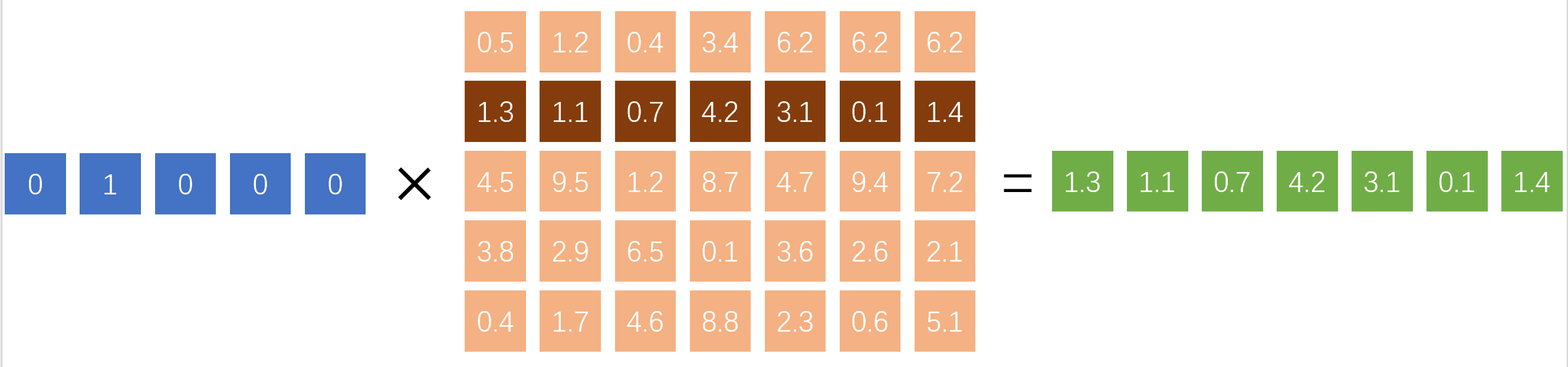 权重矩阵的形状为[vocab_size, embedding_size],当一个one-hot向量与其相乘时,因为one-hot向量中只有一个元素为1,所以计算结果实际上只与权重矩阵中的一行有关,计算输出值和目标值的误差后进行反向传播,也只有权重矩阵中的一行会被更新,因为其他行对输出值没有贡献。以vocab_size=5, embedding_size=7为例: