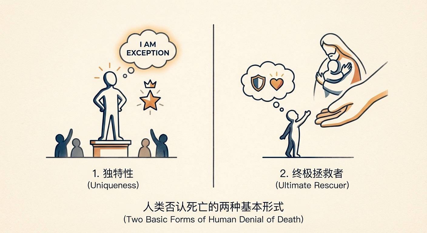 具有独特性信念的人在潜意识里相信普遍的法则不适用于我,即使我们每个人都在理性层面上清楚地知道我们与他人没有任何不同。世界不会承认任何个体的特殊性,当死亡真的来到他们身边的时候,他们通常会选择进行某种形式上的否定来缓解潜在的认知失调,不肯面对疾病治疗、不愿相信自己死后世界依然照常运转、认为遭到了生命的背叛而实际上生命从来没有许诺过任何事情。而在日常生活中,他们中的一些会极度坚持个体化,拼命追求财富、名声、权力或独特技艺,潜意识中希望这些非凡的特质能让自己成为“被命运选中的人”,追求一种象征性的不朽,从而豁免于普通人的结局;另一些则由于过度重视自身独特性而忽视了他人的权益,最终形成自恋型人格;还有一些为了减轻自己的恐惧和限制感,选择膨胀自己的控制欲,通过扩大自身能控制的事情来逃避焦虑。即便他们已经取得了无以复加的成功,也仍然摆脱不了内心的焦虑与不安,出类拔萃、鹤立鸡群,人要成为他自己的神,极端的独特就是极端的孤独,意味着无所依靠,没有相依相偎的安慰,很少有个体能够忍受如此无所遮挡的个体化孤独。当独特性的神话崩塌,人就会可能转向另一个否认机制:寻求一个终极拯救者。