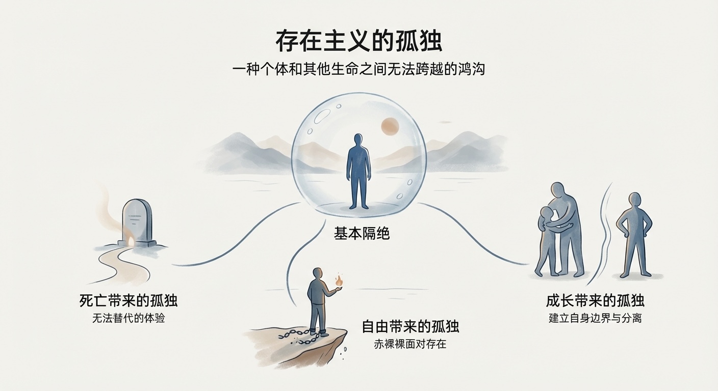 存在主义的孤独与常说的人际孤独有所不同,即使一个人在人际关系上并不孤独,存在孤独也不会消失,这是一种个体和其他生命之间无法跨越的鸿沟,是一种更基本的隔绝,即个体和世界的隔绝。这种存在孤独有下面几种表现方式: