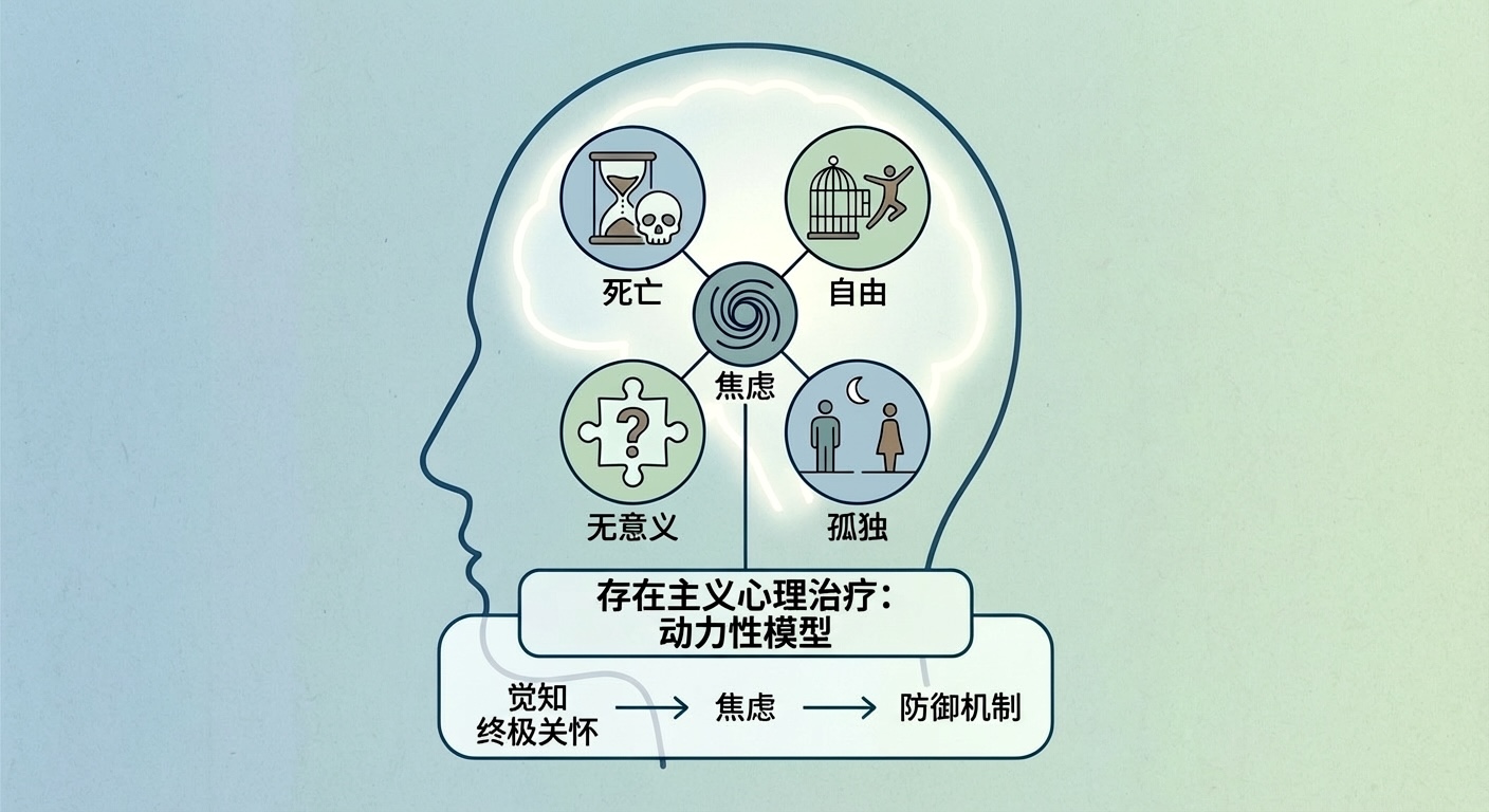 这四种终极关怀构成存在主义心理治疗的主体,组成其基本动力性结构:对终极关怀的觉察→焦虑→防御机制。人类的所有个体都处于存在主义困境当中,但某些个体无力防御或者防御不当,最终造成了心理病理的出现。