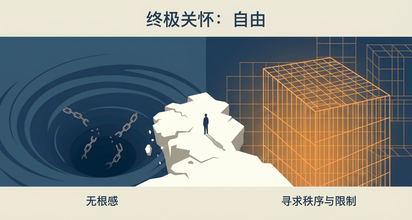 人要掌握自由就必须负担起相应的责任, 个体自由地构建了自己和自己的世界,因此需要对自己的生活负责的只有自己,如果不是个人的创造,那么世上万物都没有意义,宇宙中不存在规则、道德系统、价值、任何外在的参照物和宏大的计划。当人们觉察到自己如此重大的责任时,常常会产生一种无根感,过去所坚信的信念体系就像地面突然消失一样崩塌,让个体感觉无所立足、无所依靠。